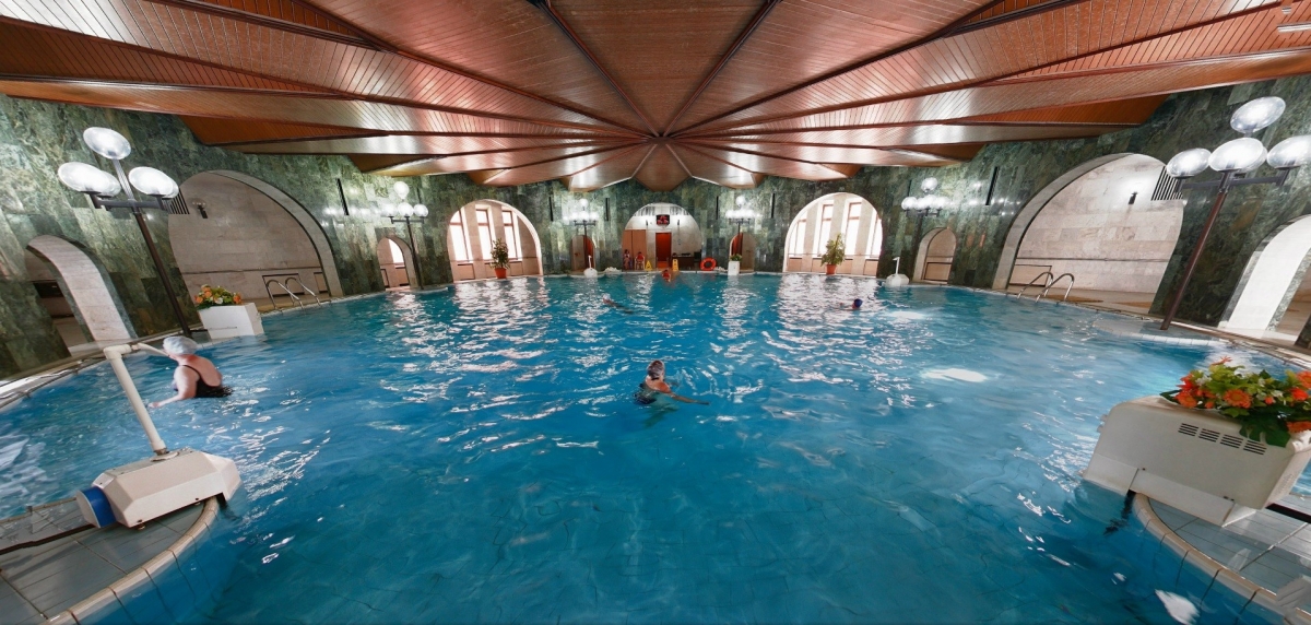 Макет бассейна разработан по индивидуальному заказу, отделка помещения выполнена из камня с декоративной текстурой. Это настоящее украшение в санатории «Решма», место, где приятно не только проходить водные процедуры, но и просто проводить время.