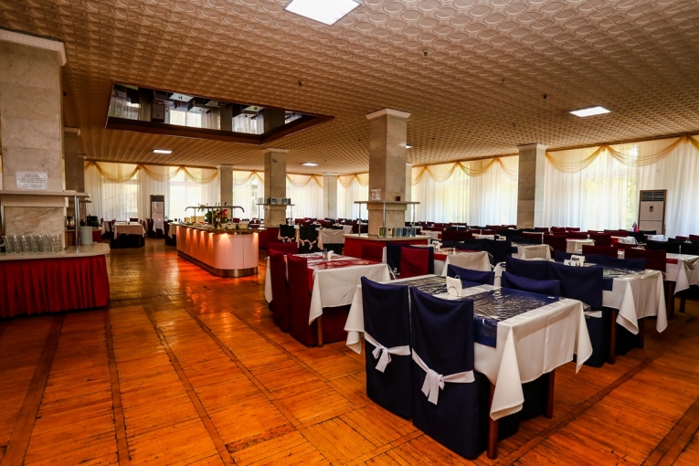 Меню разнообразное, сбалансированное. В его состав ежедневно входят мясо, рыба, молочные продукты, свежие овощи и фрукты, соки, напитки, минеральная вода. Организовано лечебное питание по диетам №№ 5, 7, 8, 9, 10, 15. Прием пищи может осуществляться в четырех комфортных залах на 250 посадочных мест каждый. Обеденные столы на 4 человека. По выбору гостей питание возможно в коммерческом или люкс-зале.