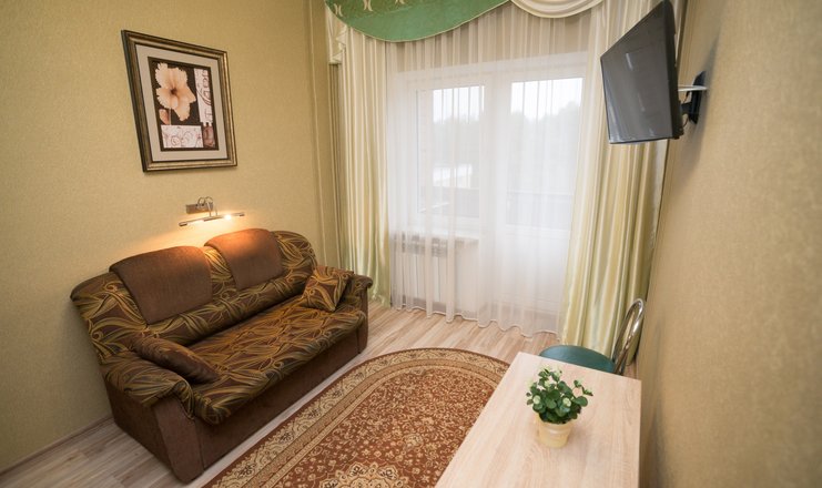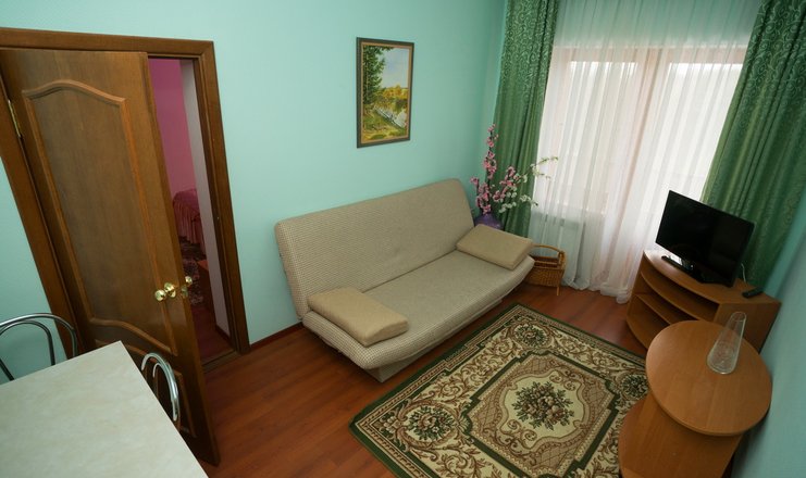 В номере: Гостиная, совмещенная с прихожей и мини-кухней: раскладной диван, журнальный столик, ЖК телевизор, 2 стула, шкаф-купе, вешалка для верхней одежды.