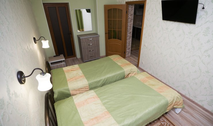 Мини-кухня: кухонный уголок, набор посуды, электрочайник, холодильник, микроволновая печь. Спальня: 2 односпальные кровати, 2 тумбочки, ЖК телевизор, комод, зеркало, кондиционер, гладильная доска, утюг.